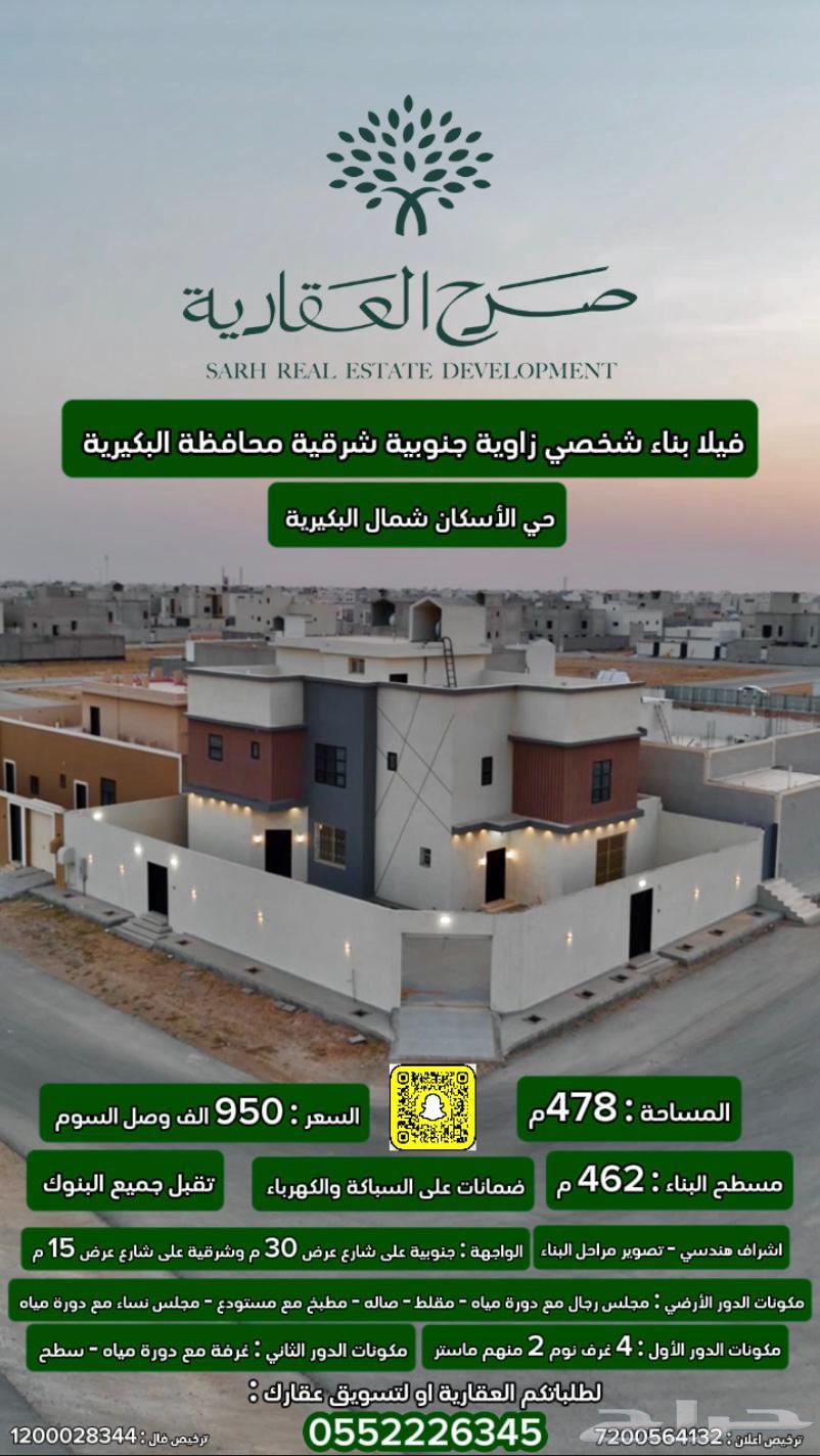 تسويق عقاري - وساطة عقارية - تطوير عقاري للبيع فيلا بناء شخصي محافظة البكيرية حي ( الأسكان) ▫️المساحة: 478 م ▫️الواجهة: جنوبية على شارع عرض 30م وشرقية على شارع عرض15م ▫️العمر : جديد ▫️اشراف هندسي - تصوير مراحل البناء ▫️ضمانات على السباكة والكهرباء ▫️السعر : 950 الف السوم ▫️ مكونات الدور الأرضي : مجلس رجال مع دورة مياه - مقلط - صاله - مطبخ مع مستودع - مجلس نساء مع دورة مياه ▫️مكونات الدور الأول : 4 غرف نوم 2 منهم ماستر ▫️مكونات الدور الثاني : غرفة مع دورة مياه - سطح ▫️الموقع: **** - ترخيص فال : 1200028344