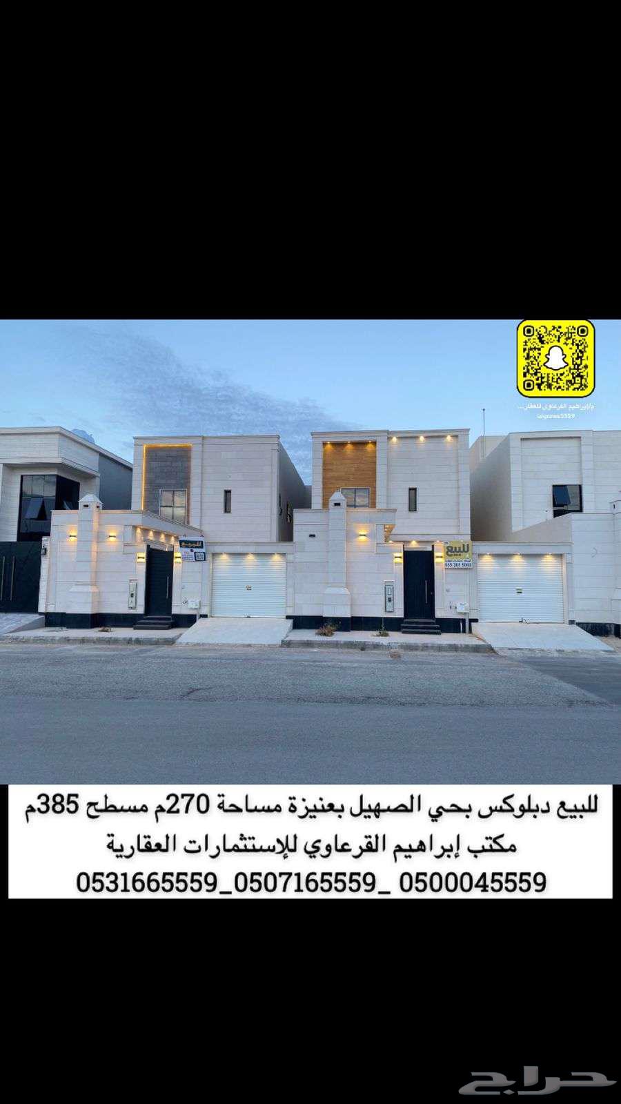للبيع فلل بحي الصهيل بعنيزة رقم العقار : 2051 مساحة الأرض : 270م مسطح البناء : 385م