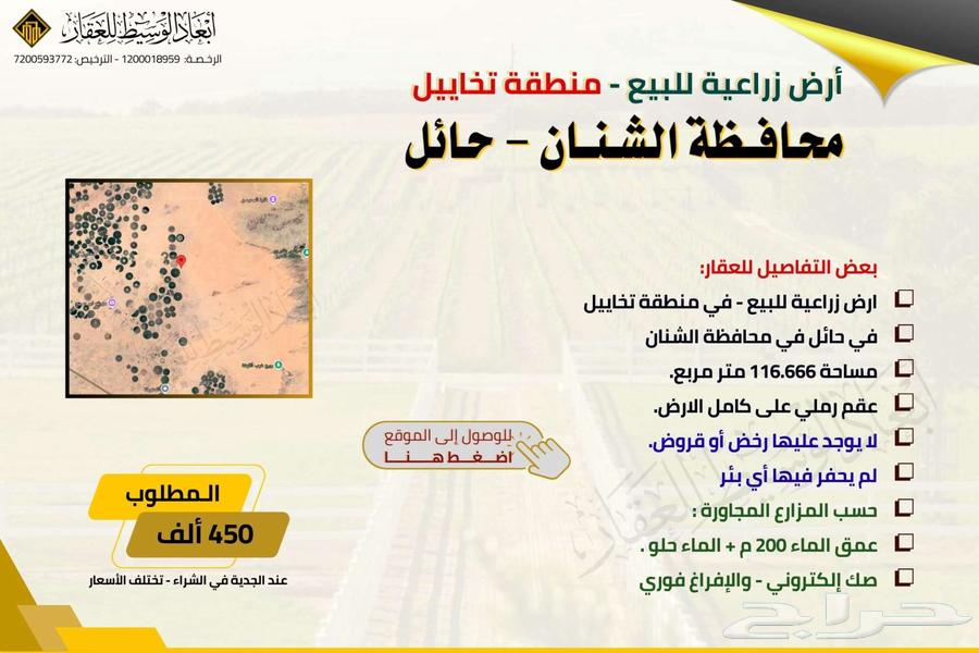 بعض التفاصيل للعقار: ارض زراعية للبيع - في منطقة تخاييل في حائل في محافظة الشنان مساحة 116.666 متر مربع. عقم رملي على كامل الارض. لا يوجد عليها رخض أو قروض. لم يحفر فيها أي بئر حسب المزارع المجاورة : عمق الماء 200 م + الماء حلو . صك إلكتروني - والإفراغ فوري
