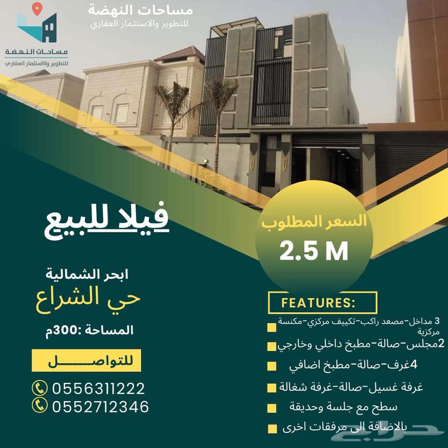 للبيع فيلا دبلكس المساحة 300 م مسطح البنا 468 م 3 شوارع +3 مداخل شرق .غرب ؛جنوب . تتكون من : كراج غرفة سايق مسبح
