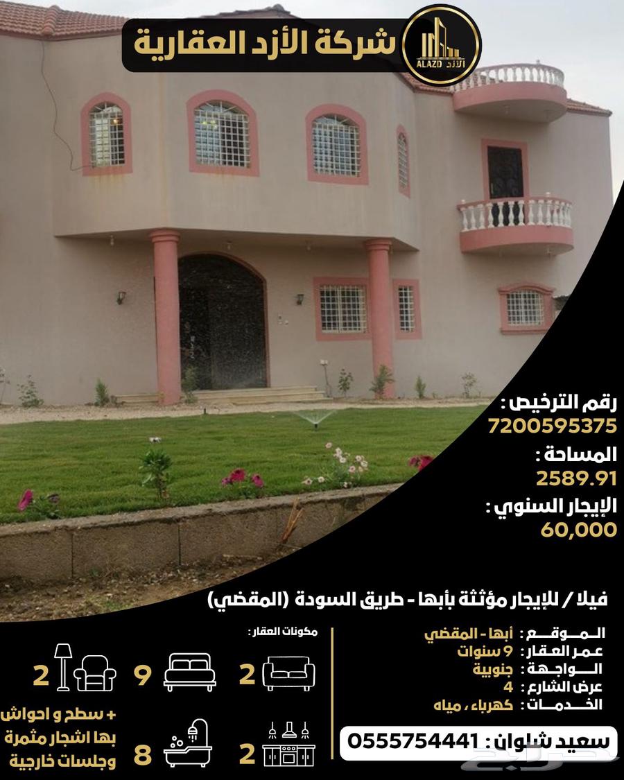 ✅ شركة الأزد العقارية ✅ القدرة على التسويق ✅ تقييم عقاري معتمد ✅ توثيق عقود الإيجارات ✅ إقامة المزادات العقارية الالكترونية ( أسرع طريقه لبيع عقارك ) فيلا للإيجار مؤثثة بأبها - طريق السودة (المقضي) تتكون الفيلا من دورين مؤثثة ومجهزه 1- الأرضي 4 غرف نوم - مجلسين - مقلط - صاله - مطبخ - دورتين مياة 2- الاول خمس غرف ماستر بدورة مياه - صاله كبيرة - مطبخ / راكب + فرن - 1 دورة مياة غاز مركزي , عداد كهرباء مستقل , سطح يوجد جلسات خارجية واحواش بها اشجار مثمرة تبعد عن مدينة ابها 8 كلم وتبعد عن المنتزهات 5 كلم الى 6 كلم الايجار السنوي : 60,000 ريال رخصة فال :1200006125 ترخيص الإعلان : 7200595375 🔸ابو مشاري لمزيد من الاستفسارات ( رقم الجوال يظهر عند الضغط على زر تواصل ) 🔸 اضغط للمحادثة الفورية على الواتساب / ( رقم الجوال يظهر عند الضغط على زر تواصل ) ----- نأمل مطابقة الموقع على الخريطة مع الموقع حسب الصك الضمانات و مدتها: لايوجد