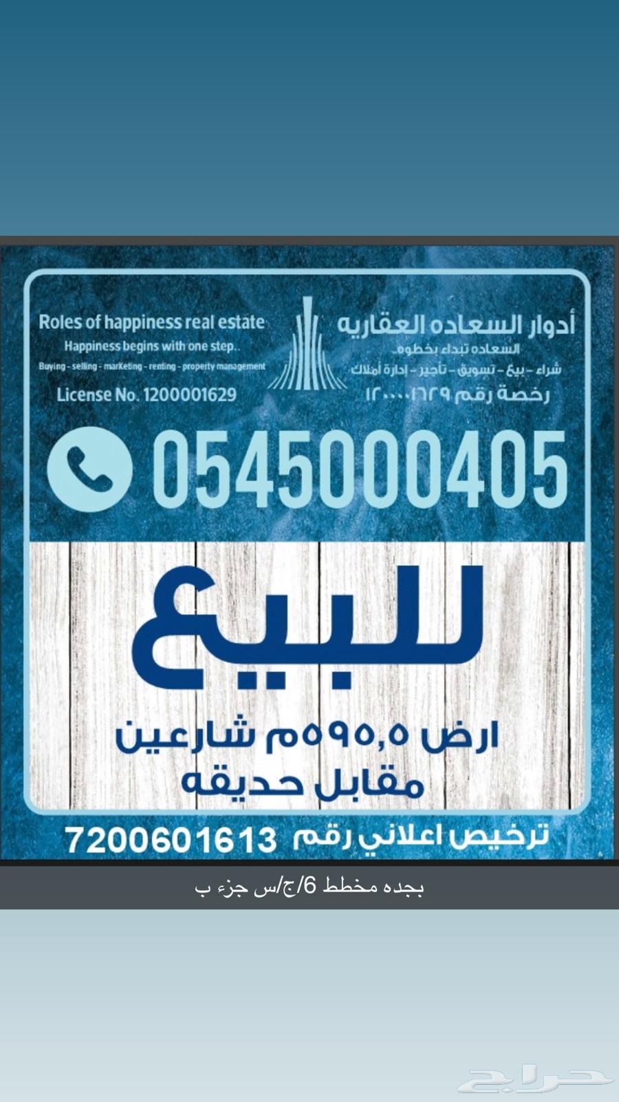 بسم الله والصلاه والسلام علي خير البشريه اللهم اني اسئلك من فضلك للبيع ارض على شارعين 15 &15 شماليه غربيه امام حديقه بمخطط 6 /س/ج/جزء ب رقمها 437 المطلوب مليون و 300 الف صافي للستفسارات والمعاينه ( رقم الجوال يظهر عند الضغط على زر تواصل )