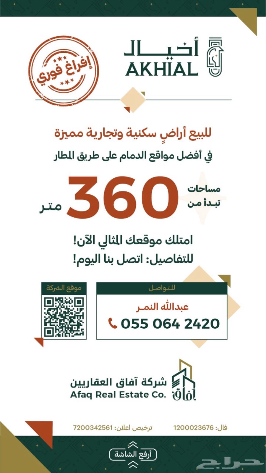 صاحب الترخيص : شركة افاق العقاريين للعقارات قابضة تاريخ انتهاء رخصة الإعلان : 2026-07-17 ----- نأمل مطابقة الموقع على الخريطة مع الموقع حسب الصك الضمانات و مدتها: لايوجد