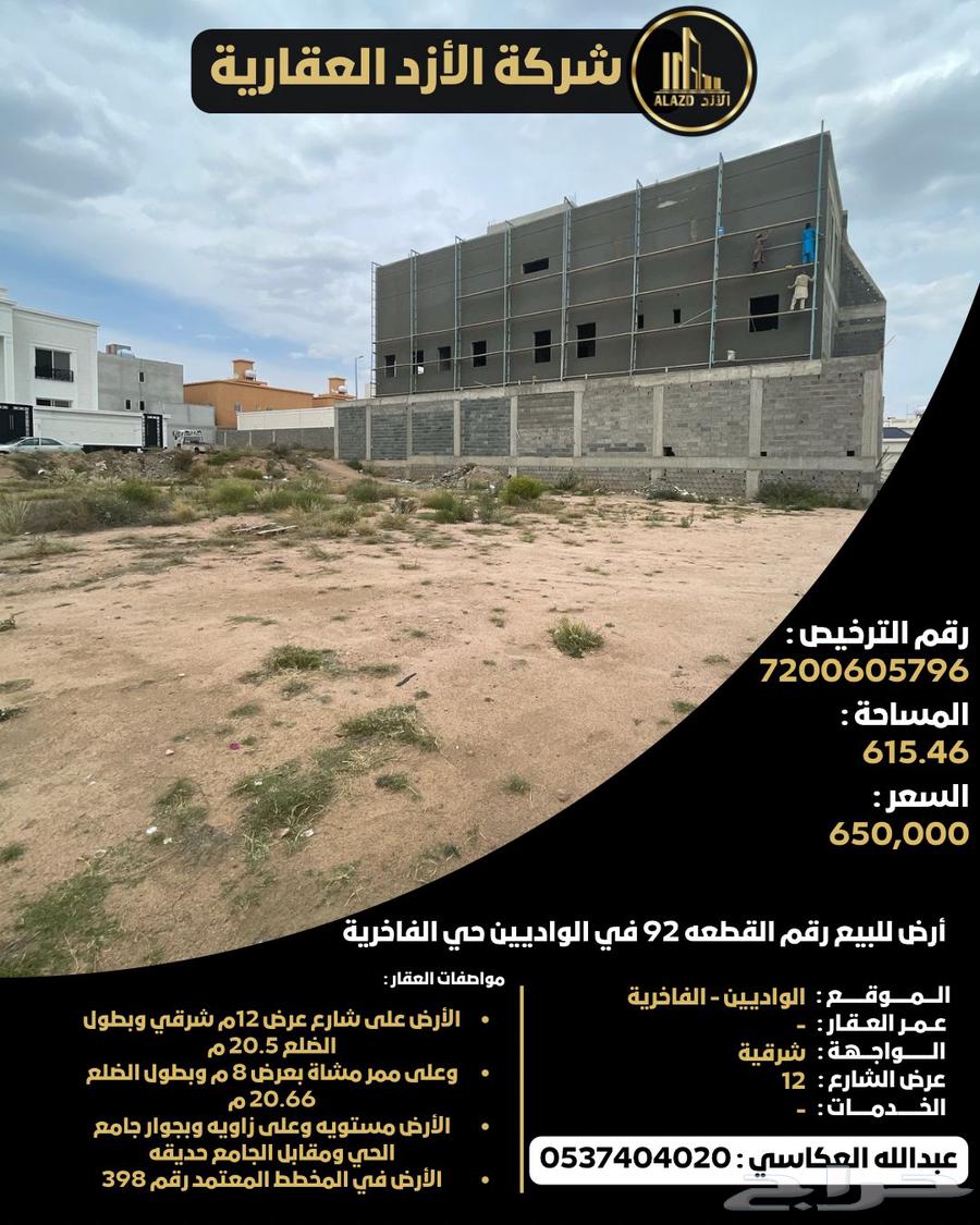 ✅ شركة الأزد العقارية ✅ القدرة على التسويق ✅ تقييم عقاري معتمد ✅ توثيق عقود الإيجارات ✅ إقامة المزادات العقارية الالكترونية ( أسرع طريقه لبيع عقارك ) أرض للبيع رقم القطعه 92 في الواديين حي الفاخرية المساحة : 615.46 م² الأرض على شارع عرض 12م شرقي وبطول الضلع 20.5 م وعلى ممر مشاة بعرض 8 م وبطول الضلع 20.66 م الأرض مستويه وعلى زاويه وبجوار جامع الحي ومقابل الجامع حديقه الأرض في المخطط المعتمد رقم 398 السعر : 650,000 ريال اعلان عقاري رقم : 7200605796 للتواصل عبدالله العكاسي (أبو بدر) : ( رقم الجوال يظهر عند الضغط على زر تواصل ) اضغط للمحادثة الفورية على الواتساب :