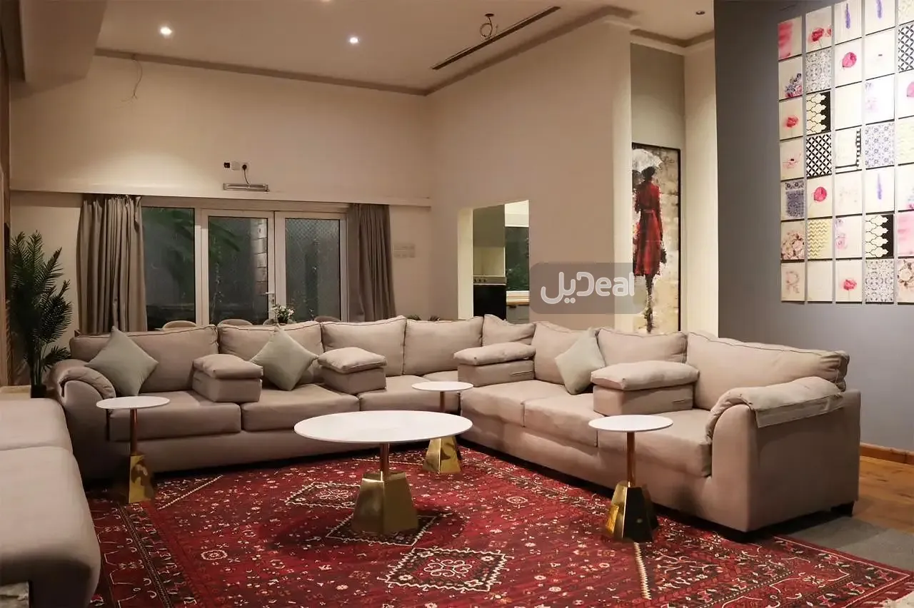 الغرف 3 غرف نوم ماستر وصالة كبيرة مع سفرة ومجلس مع خدماته مطبخين و غرفة شغالة وغرفة سواق ومستودع كبير دولاب المطبخ راكب