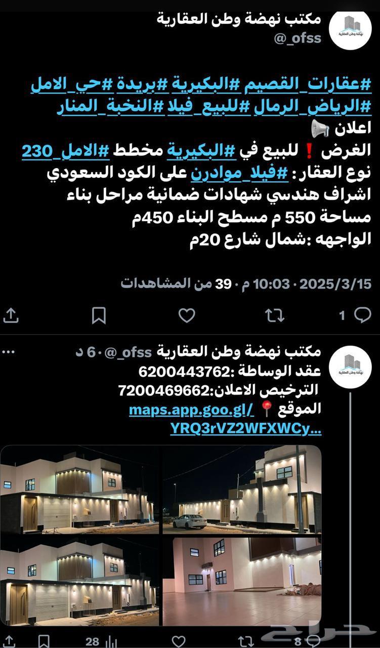 اعلان 📢مكتب نهضة وطن للخدمات العقارية الغرض❗️للبيع في #البكيرية مخطط #الامل_230 نوع العقار : #فيلا_موادرن على الكود السعودي اشراف هندسي شهادات ضمانية مراحل بناء مساحة 550 م مسطح البناء 450م الواجهه :شمال شارع 20م