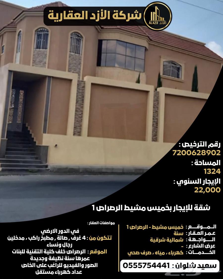 ✅ شركة الأزد العقارية ✅ القدرة على التسويق ✅ تقييم عقاري معتمد ✅ توثيق عقود الإيجارات ✅ إقامة المزادات العقارية الالكترونية ( أسرع طريقه لبيع عقارك ) شقة للإيجار بخميس مشيط الرصراص 1 في الدور الارضي تتكون من : 4 غرف , صالة , مطبخ راكب ، مدخلين رجال ونساء الموقع / الرصراص خلف كلية التقنية للبنات ️عمرها سنة نظيفة وجديدة ️الصور والفيديو للراغب على الخاص عداد كهرباء مستقل السعر : 22,000 ريال رخصة فال : 1200006125 ترخيص الاعلان : 7200628902 🔸ابو مشاري لمزيد من الاستفسارات ( رقم الجوال يظهر عند الضغط على زر تواصل ) 🔸 اضغط للمحادثة الفورية على الواتساب / ( رقم الجوال يظهر عند الضغط على زر تواصل )