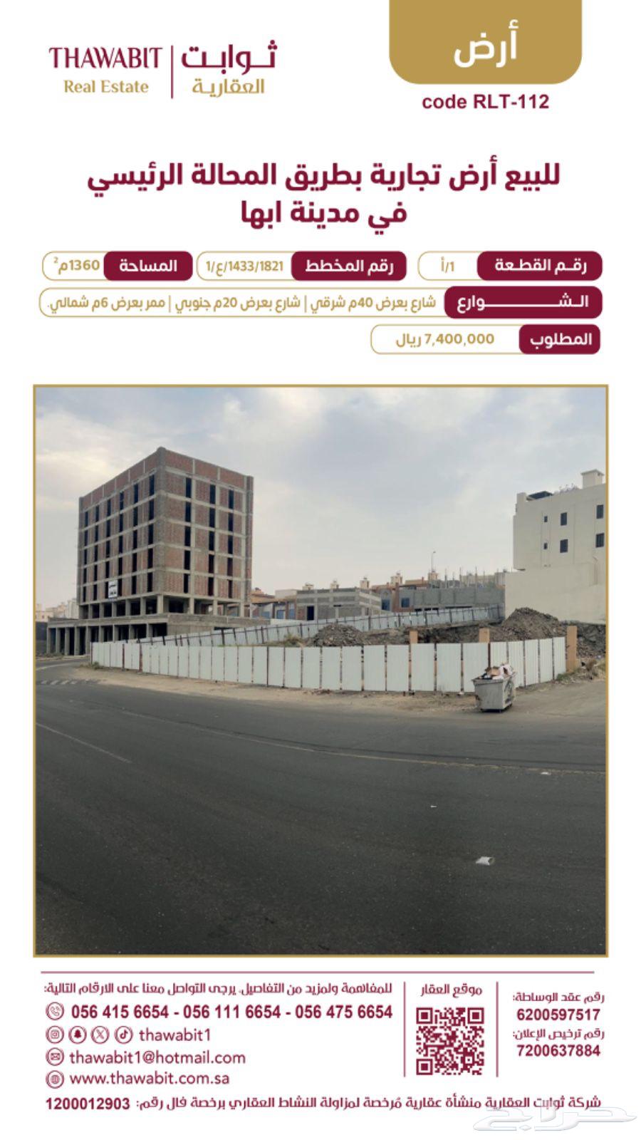 للبيع أرض تجارية بطريق المحالة الرئيسي في مدينة ابها 📌رقم القطعة : 1/أ 📌رقم المخطط : 1433/1821/ع/1 📌المساحة : 1360 م 📌الشوارع: شارع بعرض 40م شرقي. شارع بعرض 20م جنوبي. ممر بعرض 6م شمالي.