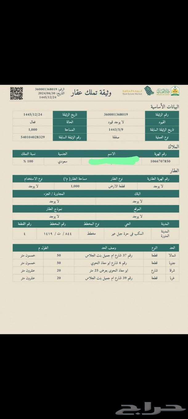 رقم الاعلان / 12 رقم الترخيص / 7200646065 قطعة الارض رقم 4 شارع ابو معاذ النحوى من المخطط رقم 844 / ت/ 1419 الواقع فى حى السكب فى حرة جبل عير بمدينة المدينة المنورة المساحة : 1000 م2 رقم القطعة : 4 المطلوب : 850 الف صافي رقم جوال المسؤول عن الاعلان / عادل/ ( رقم الجوال يظهر عند الضغط على زر تواصل ) +أ/فيصل ( رقم الجوال يظهر عند الضغط على زر تواصل ) الموقع: **** ----- نأمل مطابقة الموقع على الخريطة مع الموقع حسب الصك الضمانات و مدتها: لايوجد
