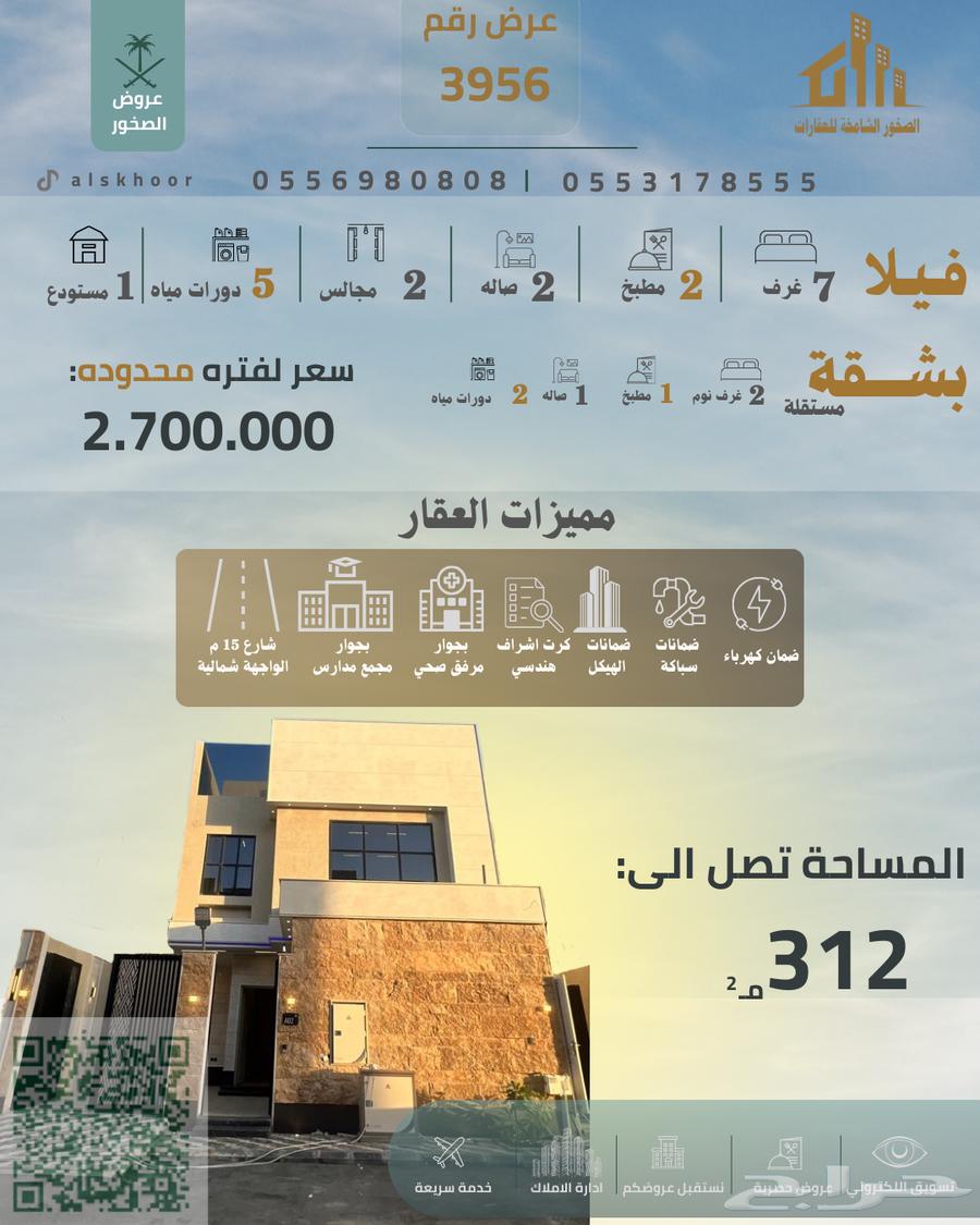 *الصخور الشامخة للعقارات* � عرض رقم : *3956* � النوع : فيلا � الحي : الرمال سما نجد � المساحة : 312.5 م � الشارع : 15 م � الواجهة : شمالية � السعر : 2700000 ريال � الوصف: فيلا درج داخلي+ شقة , - الدور الأرضي مجلس خارجي- مجلس رجال مع دورة مياه- مقلط- صالة- مطبخ مع غرفة شغالة- غرفة كبار سن- مصعد راكب- مخزن معة مكنسة كهربائية , - الدور الاول 4 غرفة نوم كلها ماستر- صالة - مطبخ , - الدور الثاني سطح فقط مؤسس مغسلة , - الشقة: غرفتين نوم- صالة- مطبخ- حمامين- سطح ( غرفة مؤسسة) , - ملاحظة: يوجد غرفة حارس في الفيلا الشرقية