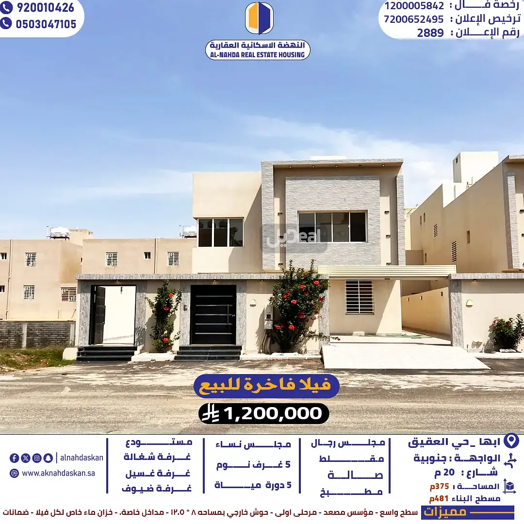 المساحة : 375م مسطح البناء : 481م الواجهة : جنوبية شارع : 20م السعر : 1,200,000