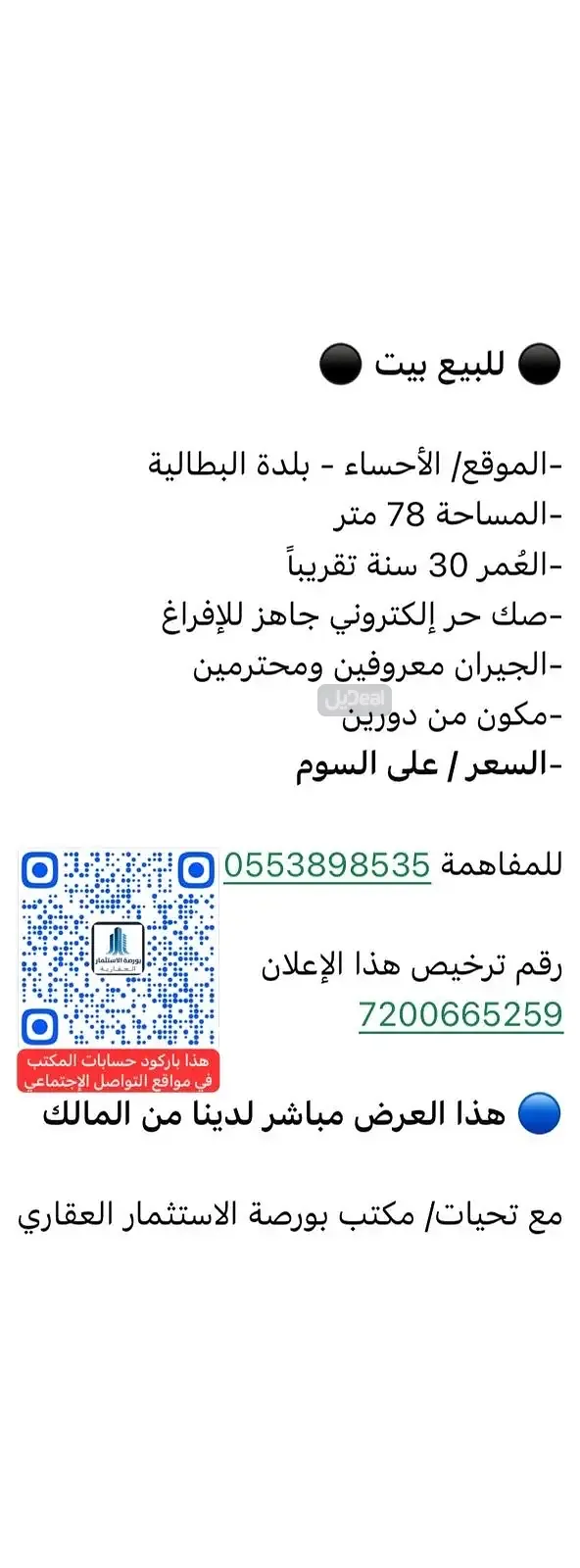 ⚫ *لبيع بيت ⚫ -الموقع/ الأحساء - بلدة البطالية -المساحة 78 متر -العُمر 30 سنة تقريباً -صك حر إلكتروني جاهز للإفراغ -الجيران معروفين ومحترمين -مكون من دورين -السعر / على السوم* للمفاهمة 0553898535 رقم ترخيص هذا الإعلان7200665259 🔵 هذا العرض مباشر لدينا من المالك* مع تحيات/ مكتب بورصة الاستثمار العقاري انظر الموقع على الخريطة الموقع على الخريطة