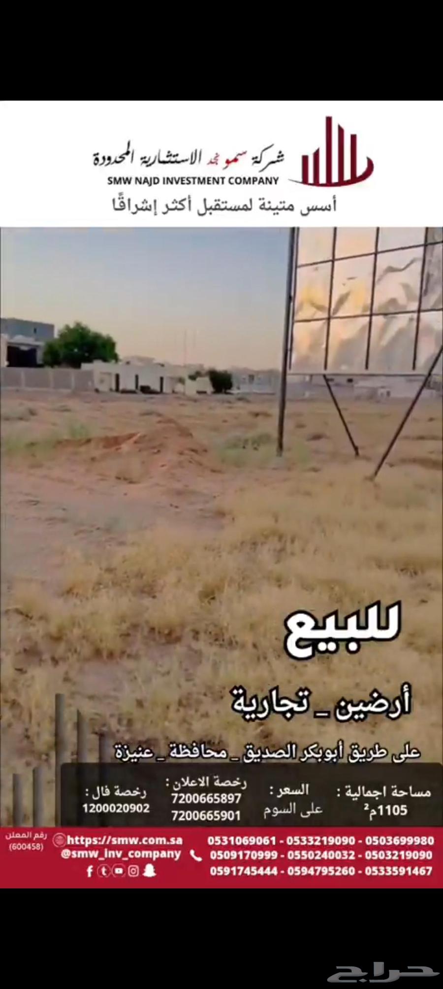 ارضين _ تجارية /على طريق: أبو بكر الصديق محافظة - عنيزة المساحةالإجمالية:1105م²