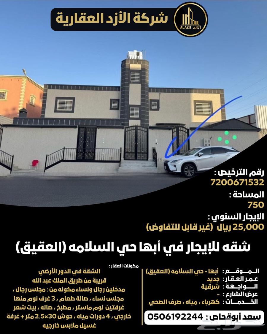 شركة الأزد العقارية ✅ القدرة على التسويق ✅ تقييم عقاري معتمد ✅ توثيق عقود الإيجارات ✅ إقامة المزادات العقارية الالكترونية ( أسرع طريقه لبيع عقارك ) شقه للإيجار في أبها حي السلامه (العقيق) الشقة في الدور الأرضي قريبة من طريق الملك عبد الله مدخلين رجال ونساء مكونه من : مجلس رجال ، مجلس نساء ، صالة طعام ، 3 غرف نوم منها غرفتين نوم ماستر ، مطبخ ، صاله ، بيت شعر خارجي ، 4 دورات مياه ، حوش 30×2.5 متر + غرفة غسيل ملابس خارجيه . الإيجار : 25,000 ريال (غير قابل للتفاوض) رقم ترخيص الإعلان : 7200671532 🔸سعد أبوقحاص لمزيد من الاستفسارات ( رقم الجوال يظهر عند الضغط على زر تواصل ) 🔸 اضغط للمحادثة الفورية على الواتساب ----- نأمل مطابقة الموقع على الخريطة مع الموقع حسب الصك الضمانات و مدتها: لايوجد