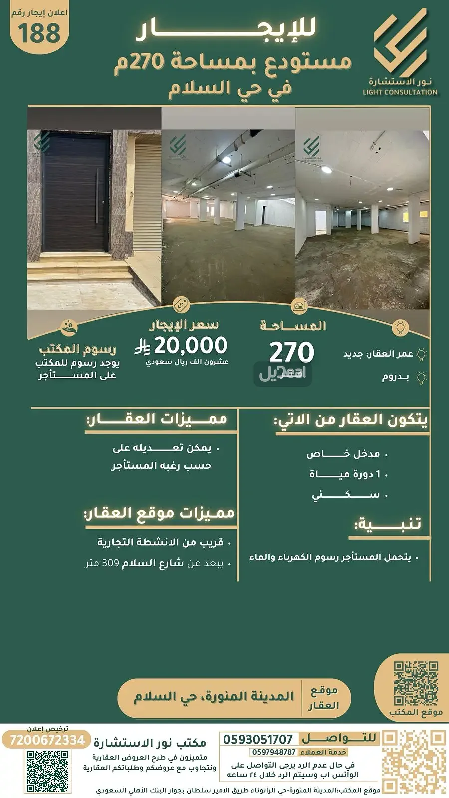 🔅اعلان ايجار رقم188 🔅 ترخيص اعلان رقم: 7200672334 🔅🔅🔅🔅🔅 7037428385 💢 للايجار مستودع بمساحة 270 م في حي السلام 💢 ☀️المساحه: 270م ☀️عمر العقار : جديد ☀️ بدروم ☀️يتكون العقار من الاتي؛ ▪️مدخل خاص ▪️1 دورة مياة ▪️سكني ☀️مميزات العقار؛ ▪️يمكن تعديله على حسب رغبه المستأجر ☀️مميزات موقع العقار؛ ▪️قريب من الانشطة التجارية ▪️يبعد عن شارع السلام309متر ⛔️تنبيه: ▫️يتحمل المستأجر رسوم الكهرباء والماء 💸سعر للايجار 20,000 عشرون الف ريال سعودي 💸 يوجد رسوم للمكتب على المستأجر 📍الموقع: المدينة المنورة حي السلام ✴️مكتب نور الاستشارة✴️ متميزون في طرح العروض العقاربة ونتجاوب مع عروضكم و طلباتكم العقارية 0593051707