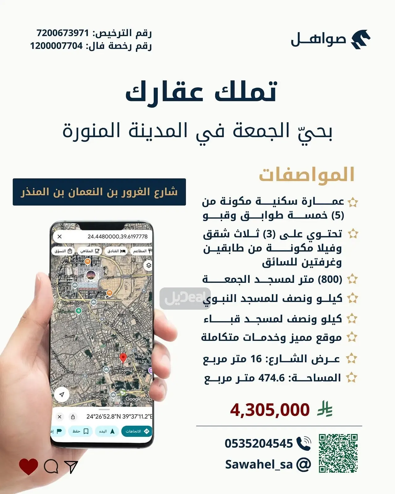 عمارة للبيع بحي الجمعة بالمدينة المنورة المواصفات: - عمارة سكنية مكونة من خمسة أدوار و قبو (بدروم) - يحتوي العقار على (3 شقق - فيلا دورين - غرفتي سائق) - عرض الشارع: 16 متر مربع • المساحــــة: 474.6 متر مربع - بالقرب من المسجد النبوي - بالقرب من مسجد الجمعة ومسجد قباء الموقع: **** مطلوب: 4،305،000ريال للتواصل والاستفسار: **** رقم الترخيص الإعلاني:7200673971 رقم رخصة فال: 1200007704 انظر الموقع على الخريطة الموقع على الخريطة