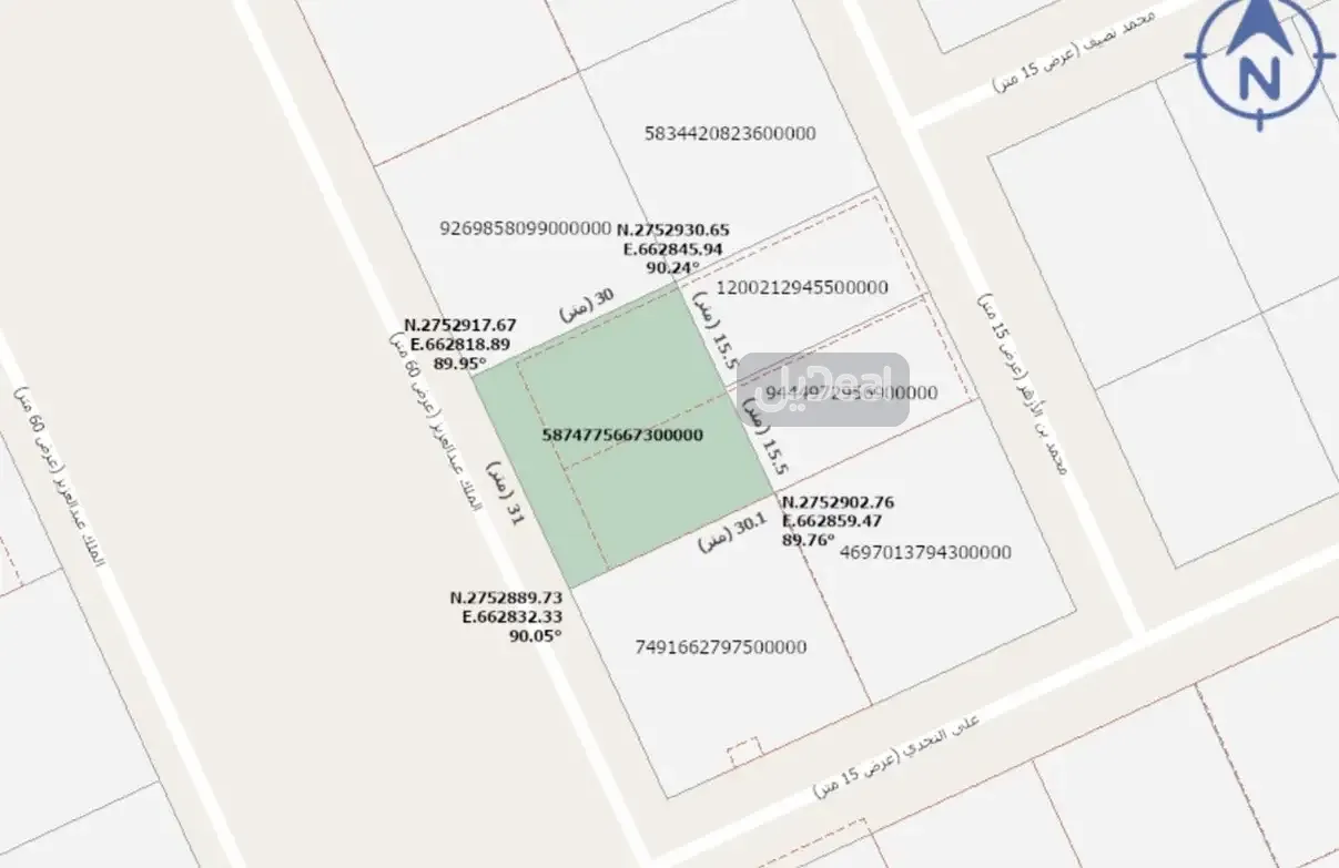 •	تجاري: 930 م² (واجهة على الملك عبدالعزيز)