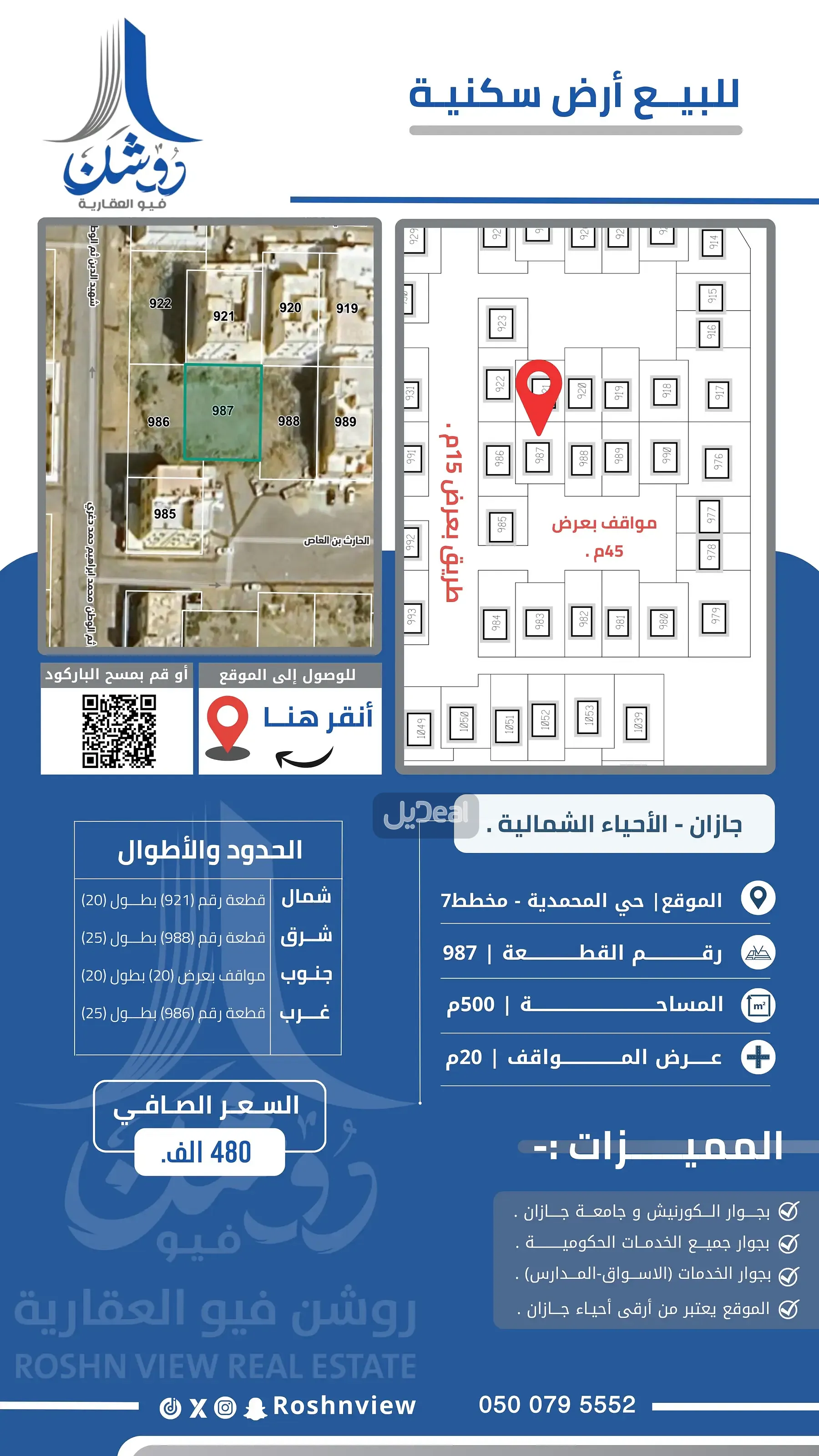 • على مواقف بعرض 45م . • الموقع يعتبر من أرقى أحياء جازان . • بجوار الجامعة والكورنيش الشمالي والواجهة البحرية . • بجوار المجمعات التجارية والاسواق التجارية . • بجوار مسجد جامع وقريب من جميع الخدمات .