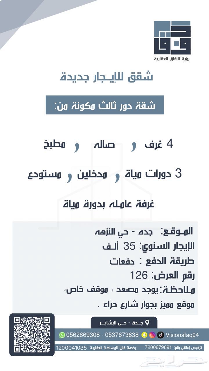 شقق للايجار حي النزهـه دور ثالث مدخلين 4 غرف صاله مطبخ 3 دورات مياه مستودع غرفة عامله بدون دورات مياه يوجد مصعد و موقف خاص موقع مميز بجوار شارع حراء ----- نأمل مطابقة الموقع على الخريطة مع الموقع حسب الصك الضمانات و مدتها: لايوجد