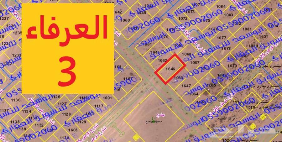 قطعة ارض رقم 1646 شارع 30متر في العرفاء رقم 3 المساحة (1035م) طبيعة ممتازة امام جامع ومقر حكومي في المخطط والسفلته الان شغاله في المخطط الارض على السوووم يا اخوان على الجوال والله ولي التوفيق للتفاصيل واستقبال العروض والطلبات ج/ ( رقم الجوال يظهر عند الضغط على زر تواصل )