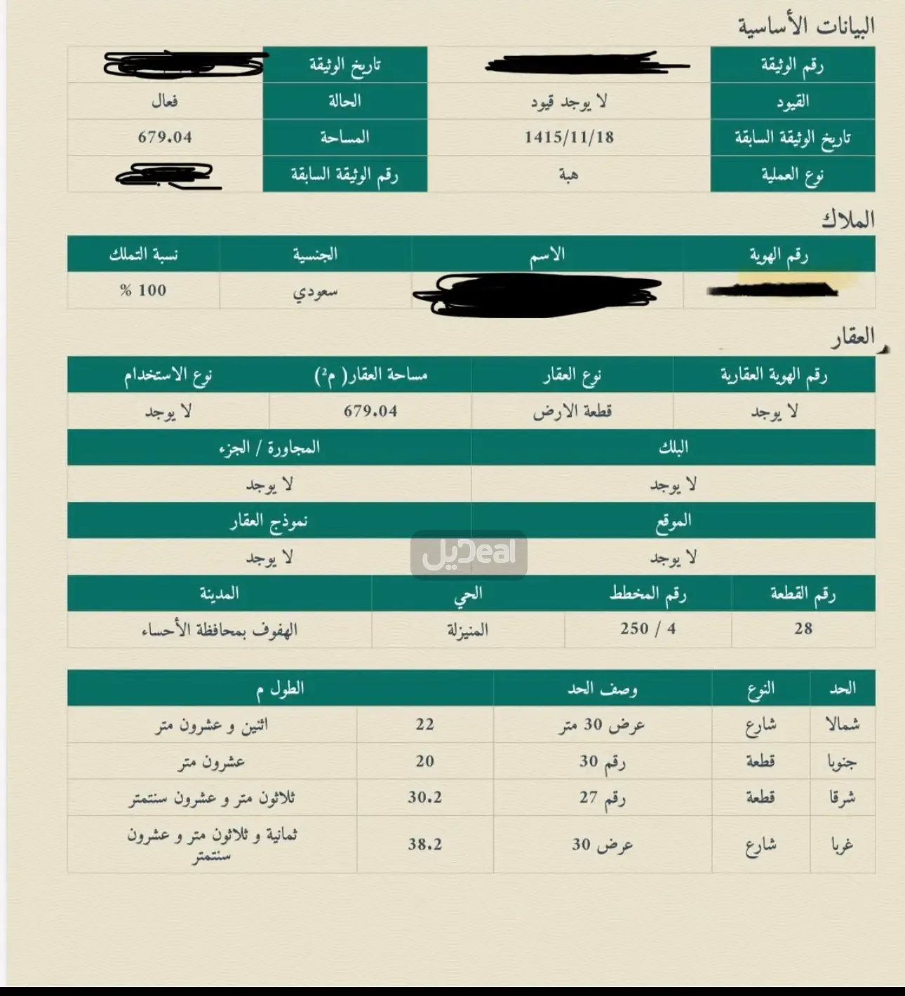 مساحة 679.04 م شمالاً: شارع عرض30 متر جنوباً: القطعة رقم 30 شرقاً: القطعة رقم 27 غرباً:شارع عرض 30