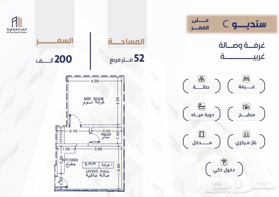 *ستوديو C* الاتجاه: غربية على الممر المساحة: 52 م2 السعر: 200,000 ريال