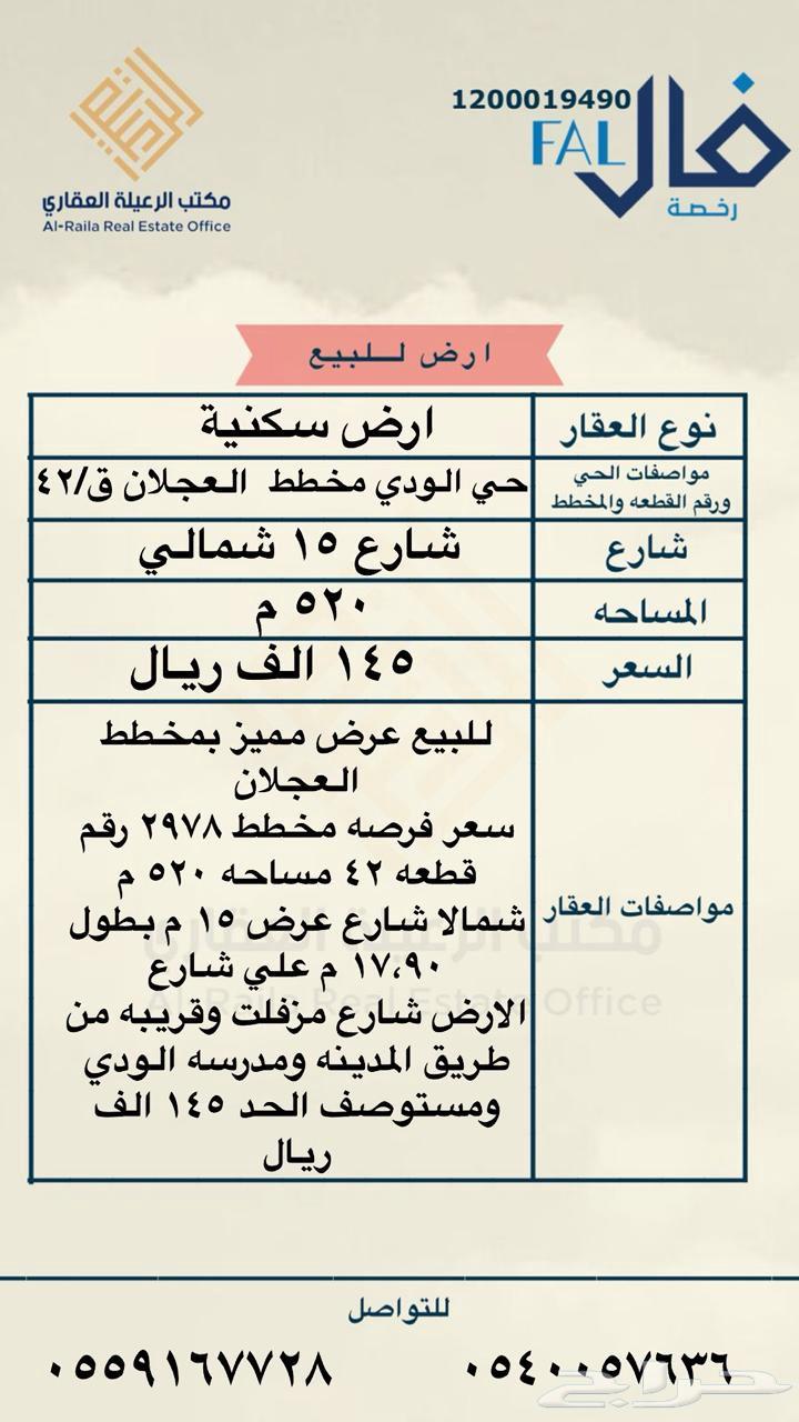 *للبيع عرض مميز بمخطط العجلان* *سعر فرصه* *مخطط 2978* *رقم قطعه 42* *مساحه 520 م* *شمالا شارع عرض 15 م* *بطول 17،90 م علي شارع*