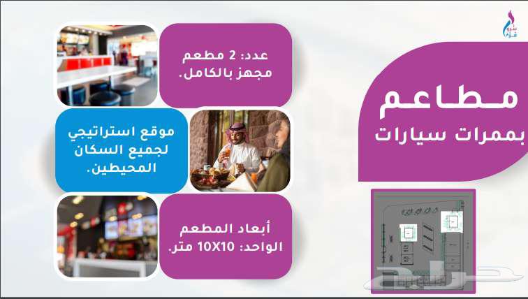 🍔 عدد المطاعم: 2 مطعم جاهز بالكامل 🚗 بممــرات سيارات (درايف ثرو) لراحة العملاء 📐 مساحة كل مطعم: 10×10 متر جاهزة للتشغيل وتخدم جميع سكان المنطقة والمارين بالطريق الرئيسي