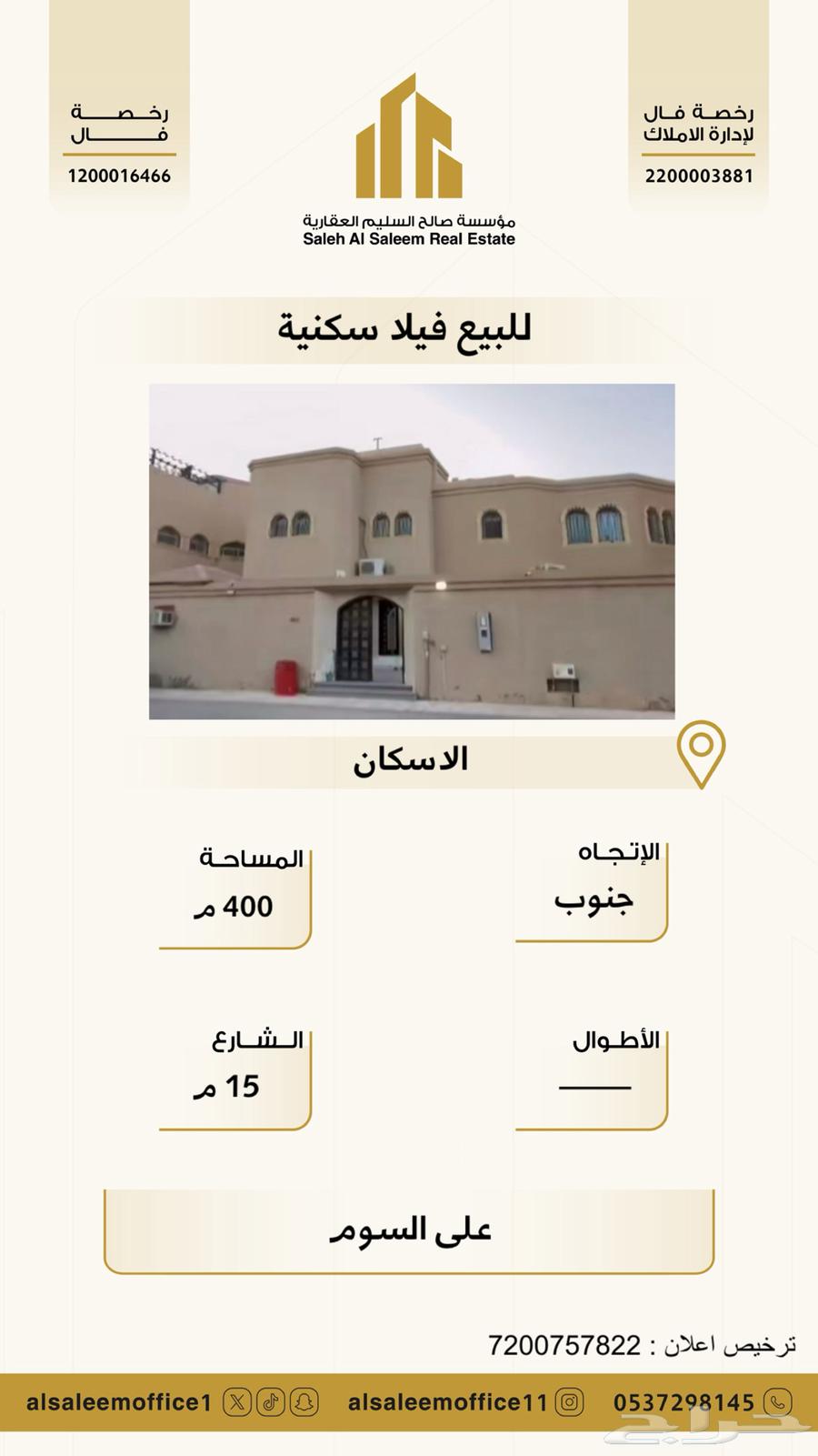 مؤسسة صالح السليم العقارية تسويق عقاري - ادارة املاك للتواصل : ( رقم الجوال يظهر عند الضغط على زر تواصل ) ( رقم الجوال يظهر عند الضغط على زر تواصل ) رخصة فال : 1200016466 ----- نأمل مطابقة الموقع على الخريطة مع الموقع حسب الصك الضمانات و مدتها: لايوجد