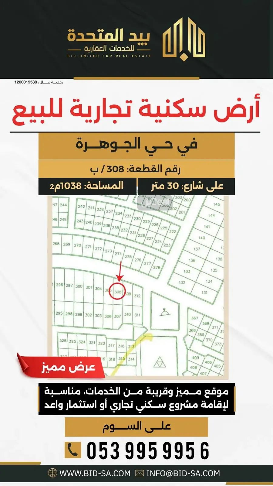 🏡 أرض للبيع في حي الجوهرة 📍 رقم القطعة: 308/ب 📏 المساحة: 1038 متر مربع 🚗 الموقع: على شارع عرض 30 متر المميزات: موقع مميز في حي الجوهرة شوارع واسعة وسهولة وصول مناسبة للاستثمار أو لبناء سكن خاص 📞 للتواصل: (0539959956)