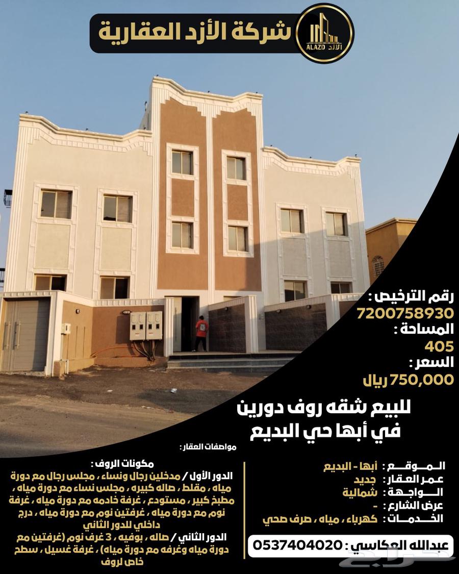 للبيع شقه روف دورين في أبها حي البديع مساحة الروف : 405 م مكونات الروف : الدور الأول / مدخلين رجال ونساء ، مجلس رجال مع دورة مياه ، مقلط ، صاله كبيره ، مجلس نساء مع دورة مياه ، مطبخ كبير ، مستودع ، غرفة خادمه مع دورة مياه ، غرفة نوم مع دورة مياه ، غرفتين نوم مع دورة مياه ، درج داخلي للدور الثاني الدور الثاني / صاله ، بوفيه ، 3 غرف نوم (غرفتين مع دورة مياه وغرفه مع دورة مياه) ، غرفة غسيل ، سطح خاص للروف يتميز الروف بمساحه كبيره وعدد غرف كثيره و 7 دوارة مياه وسطح خاص ومصعد خاص للروف عداد كهرباء خاص وعداد مياه وصرف صحي الموقع قريب من خدمات الحي ومستوصف الحي ومدارس وجامع الحي يتوسط بين أبها والمحالة وخميس مشيط والمطار عليه ضمان كامل سباكه كهرباء واساسات السعر : 750,000 ريال عقد وساطه رقم : 6200719197 إعلان عقاري رقم : 7200758930 للتواصل عبدالله العكاسي (أبو بدر) : ( رقم الجوال يظهر عند الضغط على زر تواصل ) اضغط للمحادثة الفورية على الواتساب : ----- نأمل مطابقة الموقع على الخريطة مع الموقع حسب الصك الضمانات و مدتها: لايوجد