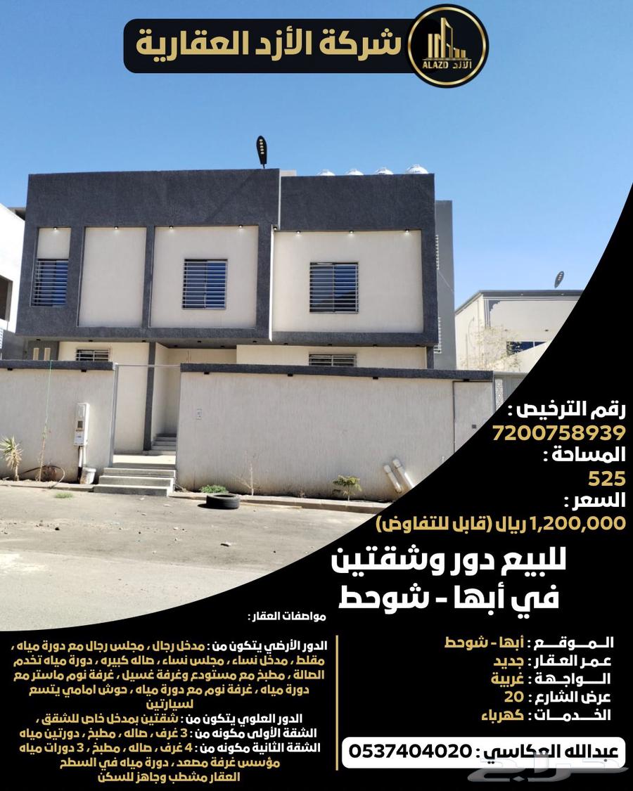 ✅ شركة الأزد العقارية ✅ القدرة على التسويق ✅ تقييم عقاري معتمد ✅ توثيق عقود الإيجارات ✅ إقامة المزادات العقارية الالكترونية ( أسرع طريقه لبيع عقارك ) للبيع دور وشقتين في أبها - شوحط مساحة الأرض : 525 م شارع عرض 20 م غربي مواصفات العقار : الدور الأرضي يتكون من : مدخل رجال ، مجلس رجال مع دورة مياه ، مقلط ، مدخل نساء ، مجلس نساء ، صاله كبيره ، دورة مياه تخدم الصالة ، مطبخ مع مستودع وغرفة غسيل ، غرفة نوم ماستر مع دورة مياه ، غرفة نوم مع دورة مياه ، حوش امامي يتسع لسيارتين الدور العلوي يتكون من : شقتين بمدخل خاص للشقق ، الشقة الأولى مكونه من : 3 غرف ، صاله ، مطبخ ، دورتين مياه الشقة الثانية مكونه من : 4 غرف ، صاله ، مطبخ ، 3 دورات مياه مؤسس غرفة مصعد ، دورة مياه في السطح العقار مشطب وجاهز للسكن السعر : 1,200,000 ريال (قابل للتفاوض) ترخيص الإعلان : 7200758939 للتواصل عبدالله العكاسي (أبو بدر) : ( رقم الجوال يظهر عند الضغط على زر تواصل ) اضغط للمحادثة الفورية على الواتساب : ----- نأمل مطابقة الموقع على الخريطة مع الموقع حسب الصك الضمانات و مدتها: لايوجد