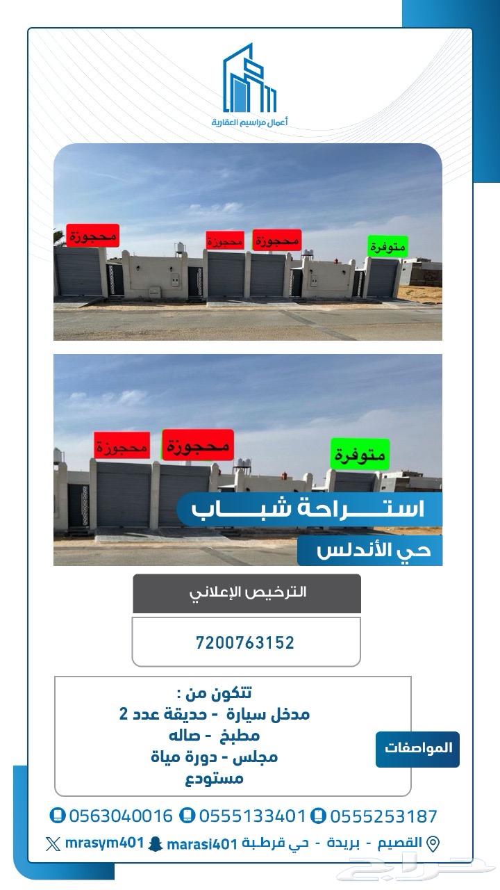 تتشرف الاستراحة بتوفير مرافق متكاملة، وتشمل: • مدخل سيارة • حديقتان • مطبخ • صالة • مجلس • دورة مياه • مستودع