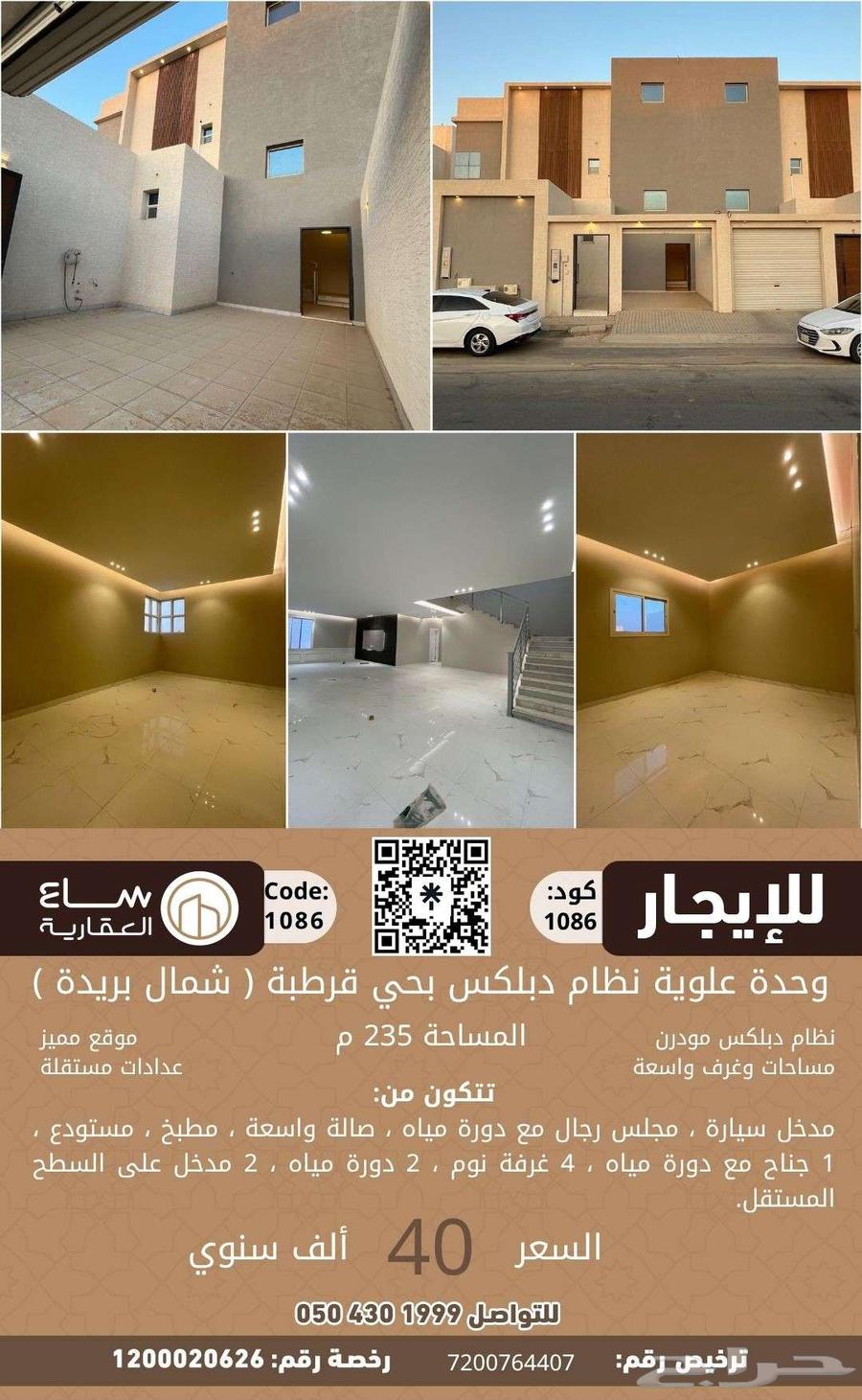 وحدة علوية نظام دبلكس بحي قرطبة ( شمال بريدة )