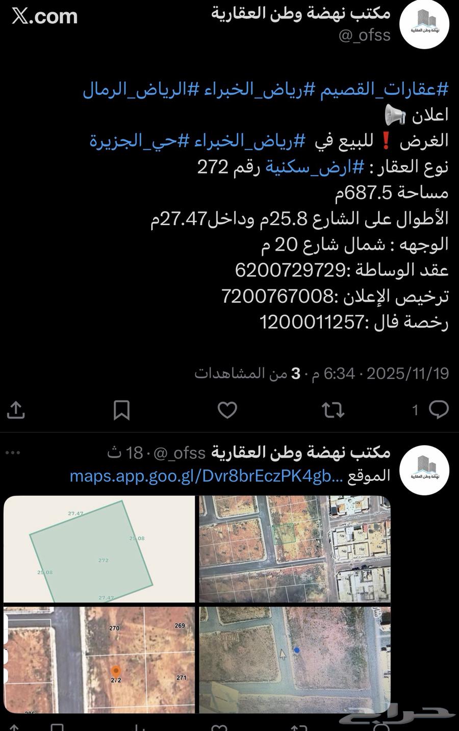 #عقارات_القصيم #رياض_الخبراء #الرياض_الرمال #للبيع_ارض اعلان 📢 الغرض❗للبيع في #رياض_الخبراء #حي_الجزيرة نوع العقار : #ارض_سكنية رقم 272 مساحة 687.5م الأطوال على الشارع 25.8م وداخل27.47م الوجهه : شمال شارع 20 م عقد الوساطة :6200729729 ترخيص الإعلان :7200767008 رخصة فال :1200011257