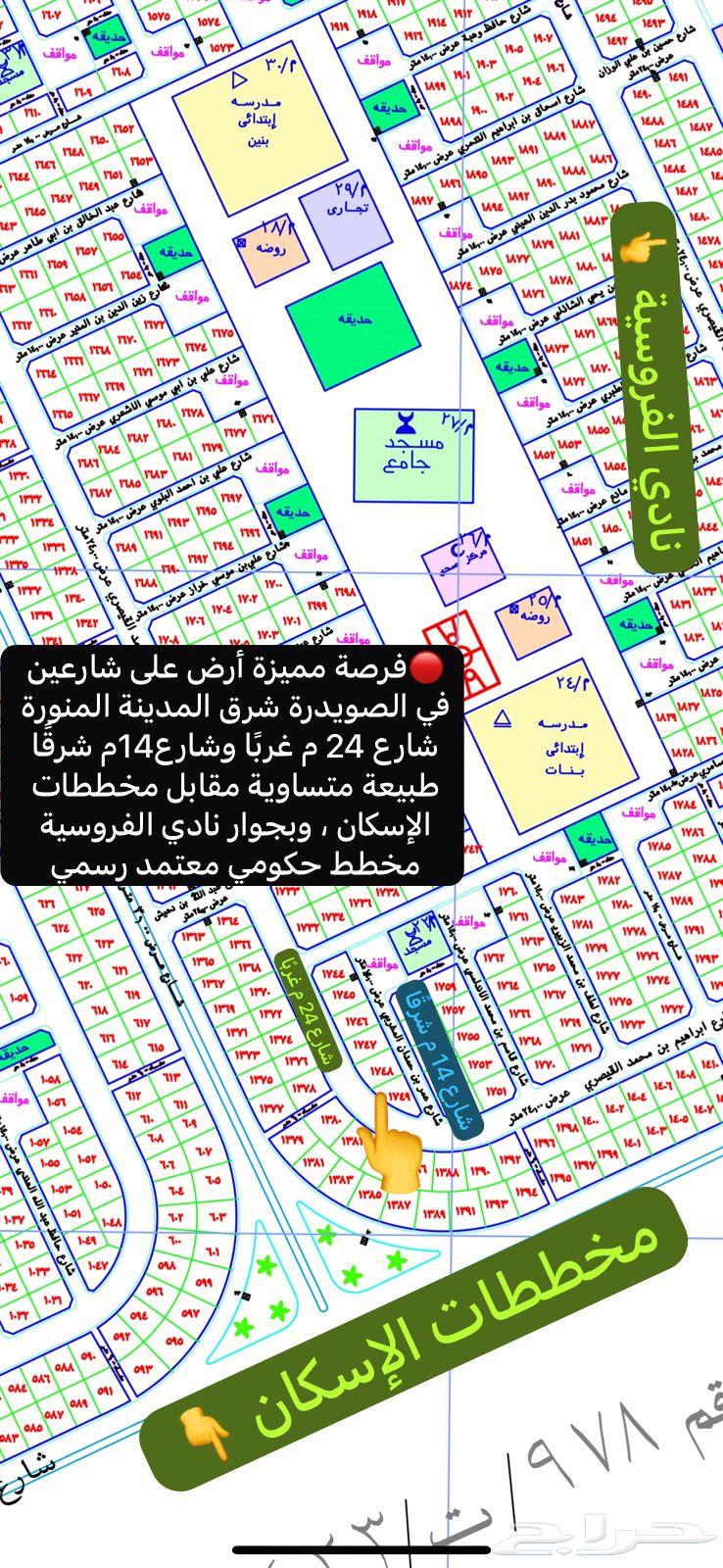 على شارعين " واجهتين " 🔷 شرقًا :- شارع عرض 14 م 🔷غربًا :- شارع عرض 24 م 🔴 بجوار نادي الفروسية 🐎 ومقابل مخططات الإسكان 🏣 🔻البيع 65 ألف صافي🔻 🌍موقع الأرض **** جوال التواصل ( رقم الجوال يظهر عند الضغط على زر تواصل ) 🔻🔻🔻 لدينا أراضي للبيع مميزة في مخططات الصويدرة شرق المدينة المنورة✅ في مخططات حكومية معتمدة بلدية لا توجد فيها مشاكل ابدًا ✅ بصكوك شرعية رسمية حرة وإفراغات فورية إلكترونية ✅ تبدأ المساحات تقريبًا من 300 م إلى 660 م ✅ والأسعار تبدأ من 58 ألف ريال إلى 120 ألف✅ و بخبرتنا نرشدك وبالصدق نعاملك 💐✅ عنواننا الصدق والأمانة والإخلاص 🌸 ✅ أهـلًا وسهلا ومرحبًا بالجميع 🌹✅ للتواصل ( رقم الجوال يظهر عند الضغط على زر تواصل ) ( رقم الجوال يظهر عند الضغط على زر تواصل ) ( رقم الجوال يظهر عند الضغط على زر تواصل ) ----- نأمل مطابقة الموقع على الخريطة مع الموقع حسب الصك الضمانات و مدتها: لايوجد
