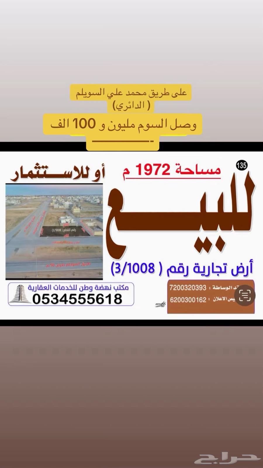 الغرض❗للبيع في #البكيرية مخطط #اليرموك_375 نوع العقار : #ارض_تجارية #رقم _3/1008 مساحة 1972م الواجهة: شمال شارع 20م ثم يليه 50 م طريق ( محمد علي السويلم) الوجهة : شرق شارع 20 م ثم يليه 30 م الوجهة : غرب ممر 6 م