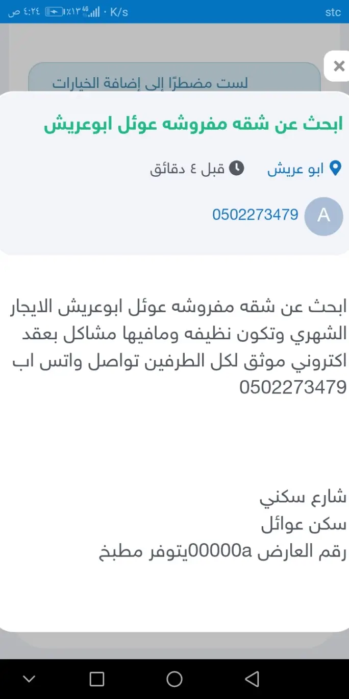 السلام عليكم ورحمة الله وبركاته صباح الخير استاذي ابحث عن شقه مفروشه في ابوعريش عوئل عدد الاشخاص 3 والاهم تكون نظيفه وكويسه دخل ابوعريش او في مكان توجد به خدمات وبعقد اكتروني موثق لك الطرفين وتكون ايجارها بحدود 1000 او 1100 بسعر معقول وايجار شهري